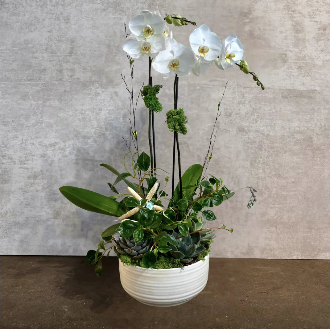 A serene arrangement featuring a white orchid, lush succulents, and greens, accented with a starfish. Presented in a stylish white ceramic pot, this piece brings a touch of coastal charm to any space. Perfect for gifts or home decor.
