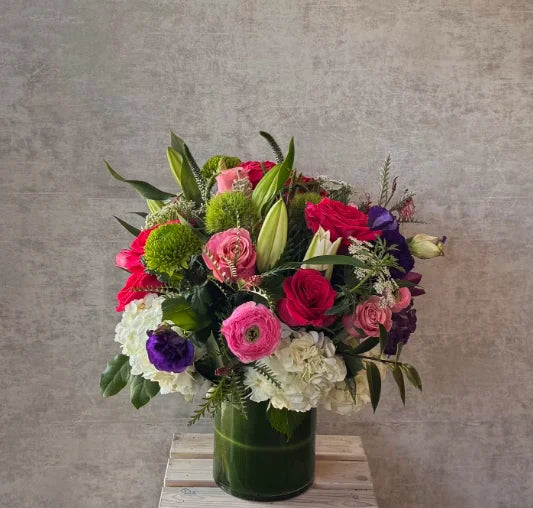 A stunning floral arrangement featuring bold hot pink roses, fresh green foliage, and elegant white hydrangeas, along with a mix of other seasonal flowers. Perfect for any occasion, this arrangement adds beauty and charm to any space. Made with fresh, high-quality blooms for a timeless and stylish look.