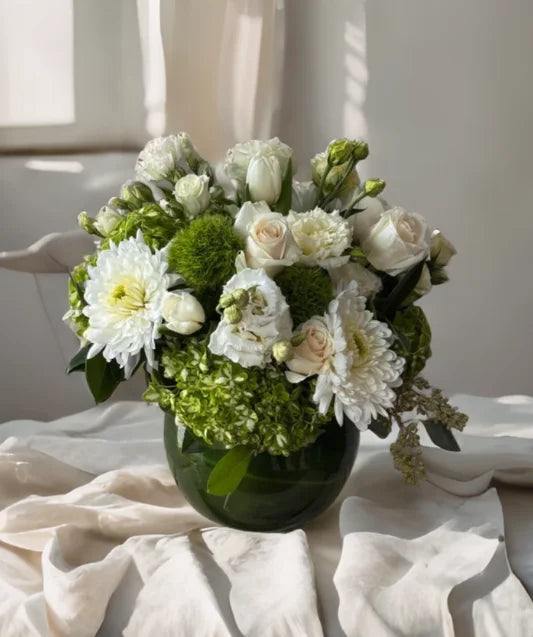 This elegant green and white floral arrangement is beautifully displayed in a sleek, modern bubble bowl.