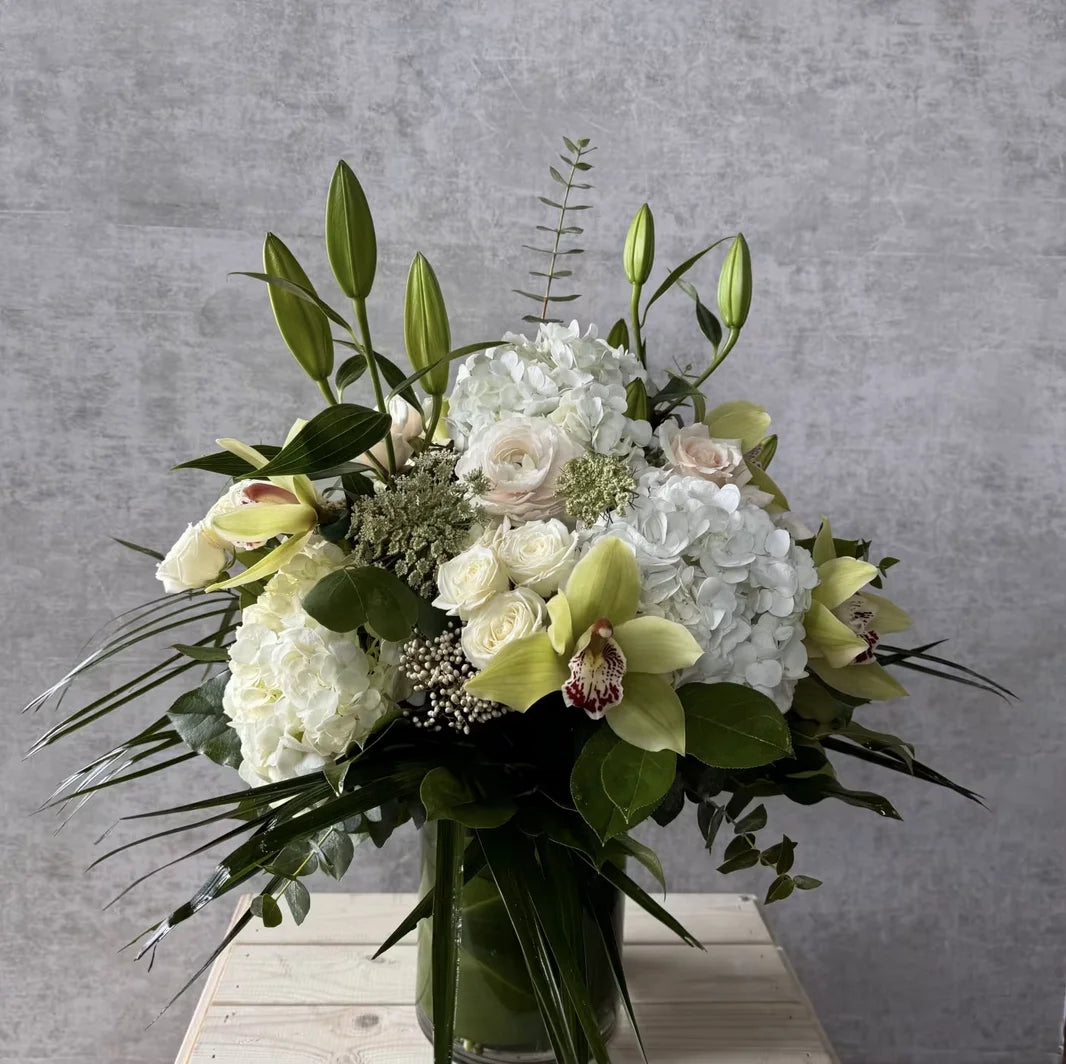The Pure Love arrangement exudes a sense of purity and calm, featuring large white blooms gently accented with touches of fresh green foliage.