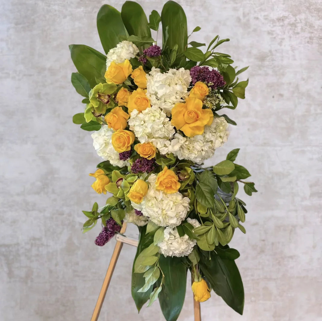 This beautiful standing spray features yellow roses, hydrangeas, cymbidium orchids and complementing greenery. Sincerely express your love and remembrance of a beloved life lost and express your sentiments of adoration and wishes for peace with this stunning spray. Includes wood easel for display.