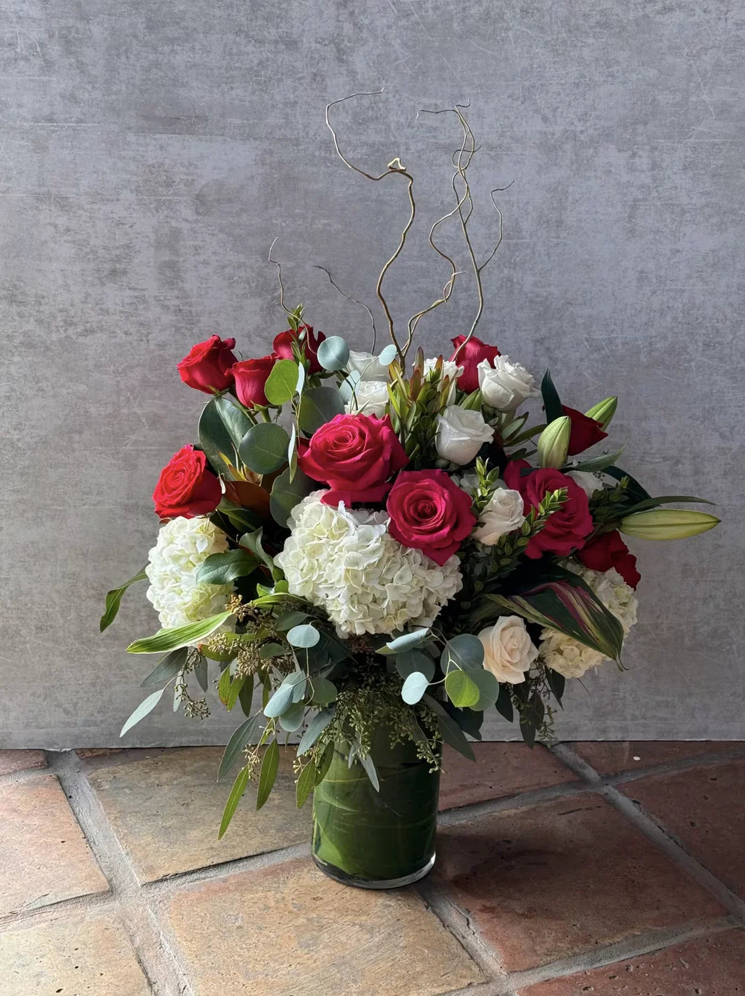 This luxurious arrangement blends the purity of white hydrangeas and white lilies with the classic allure of a dozen white roses and the deep passion of a dozen red roses. Perfectly balanced in color and form, each bloom radiates grace and beauty.