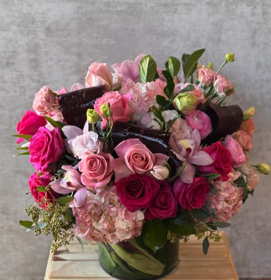 Show your love with this elegant and romantic floral arrangement, featuring a stunning combination of tall blooms and soft pink hues. The delicate pink tones evoke feelings of warmth and affection, while the height of the arrangement adds a sense of sophistication and grace.